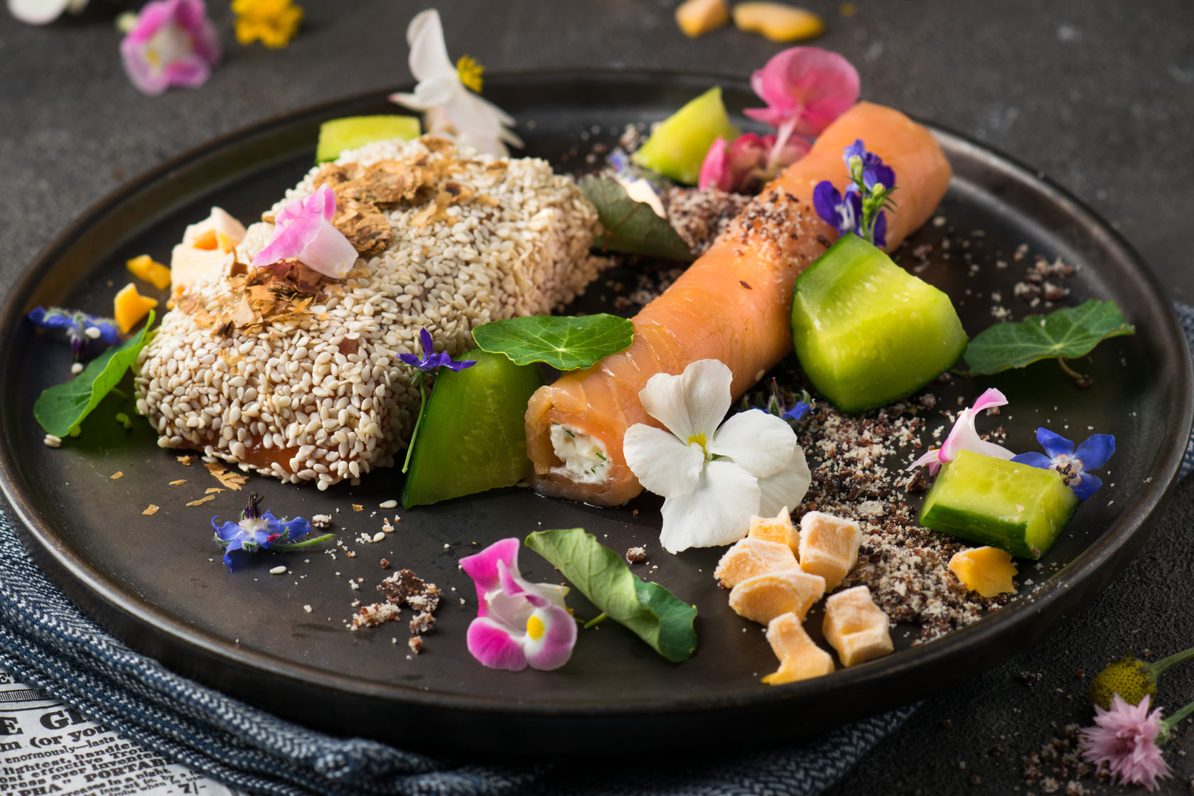 Лукумадес с морским гребешком, Тарамосалата и цукатами